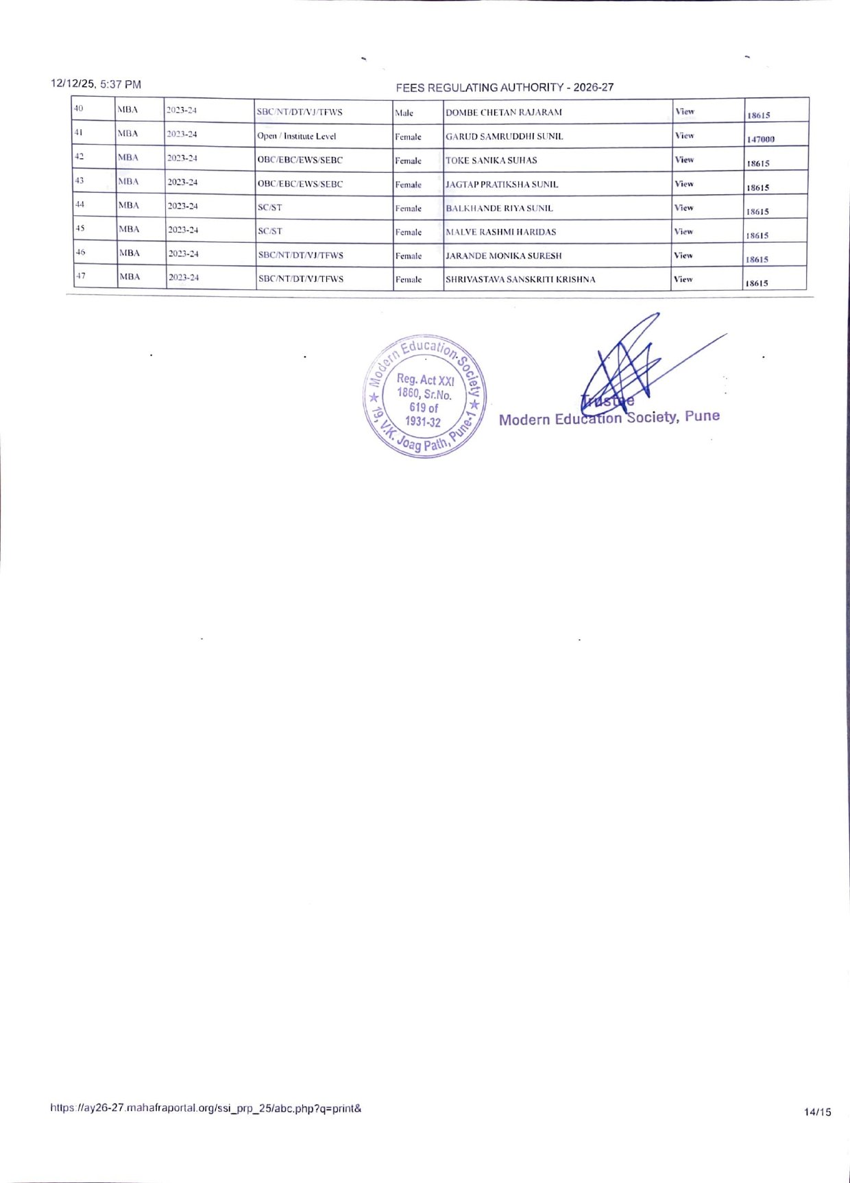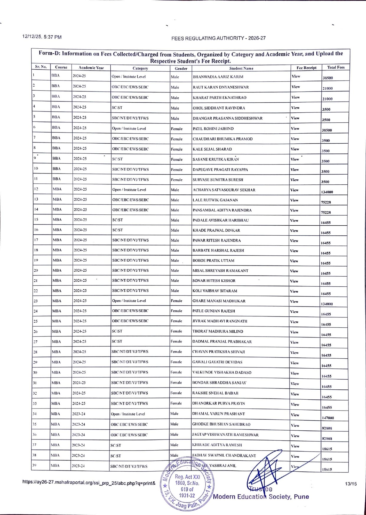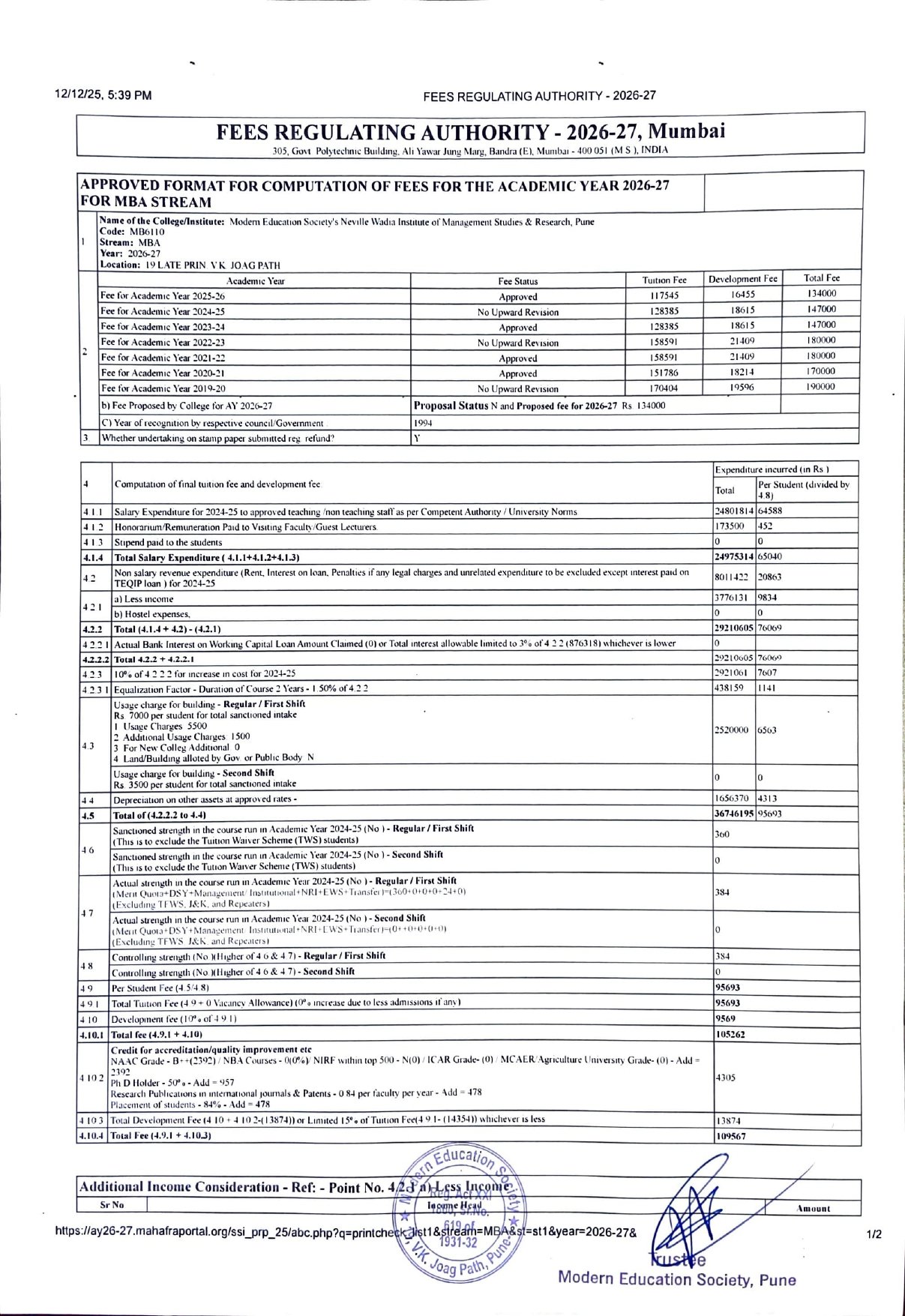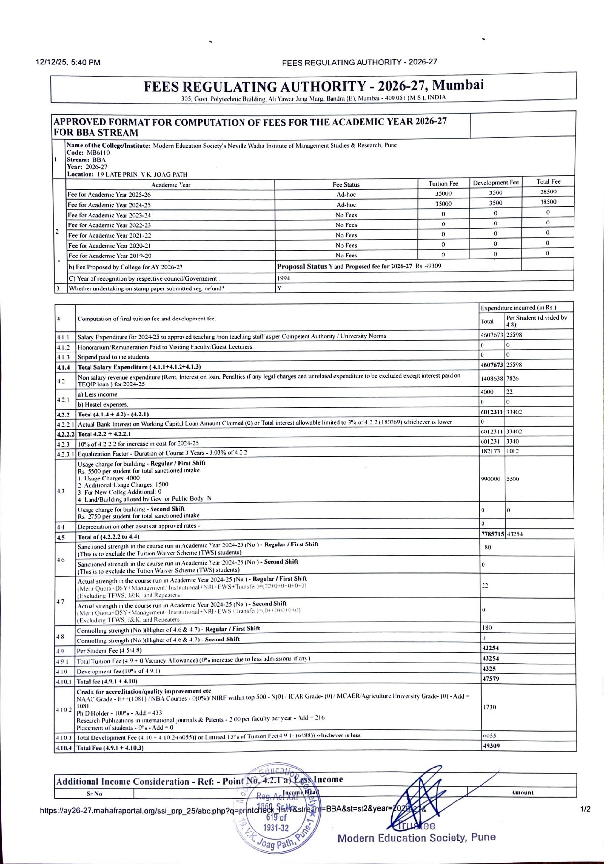 ( Note : As per the latest directives of Fee Regulating Authority (FRA), Mumbai