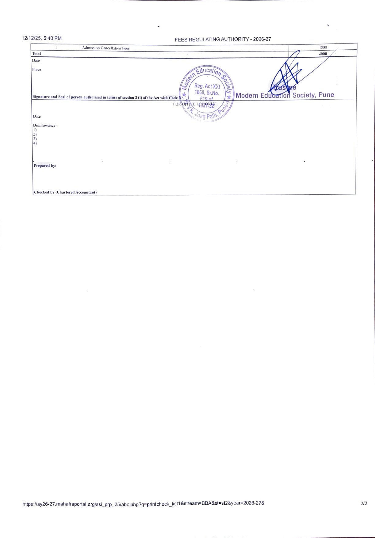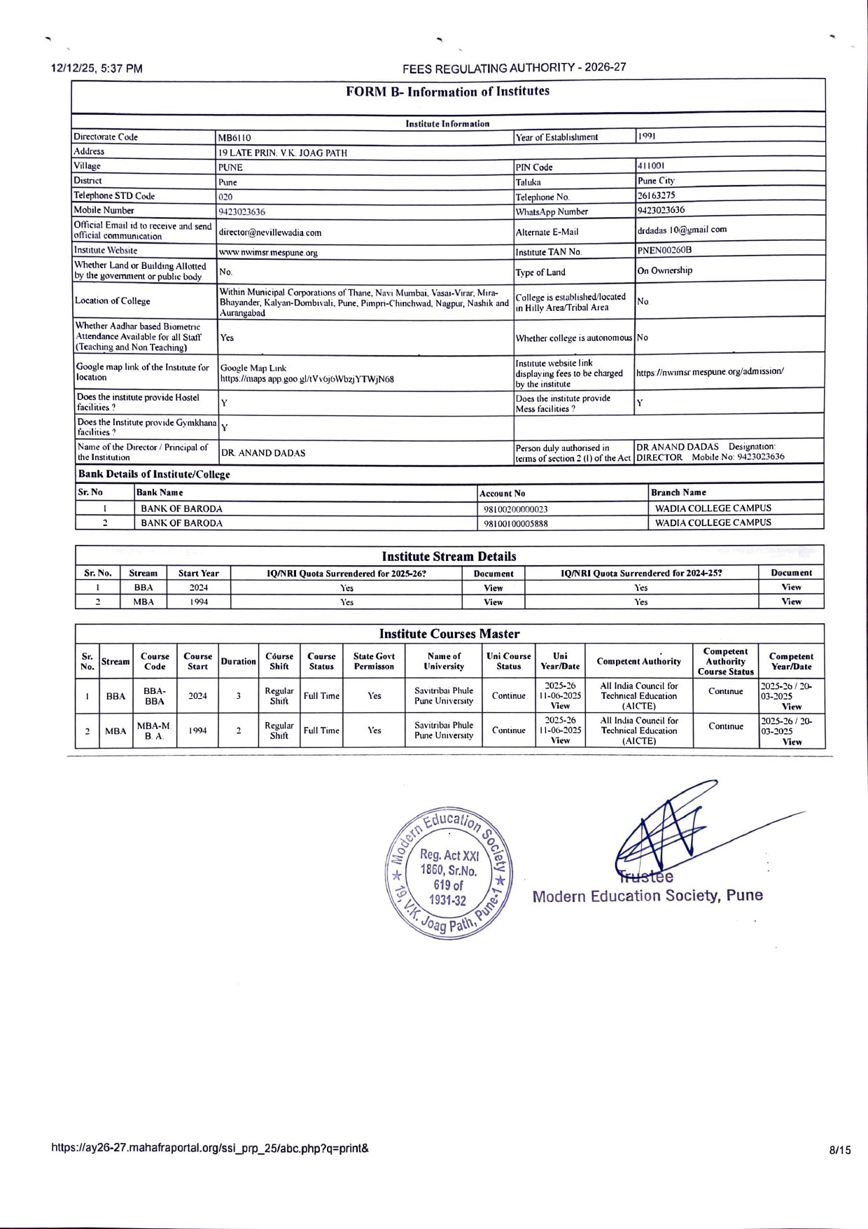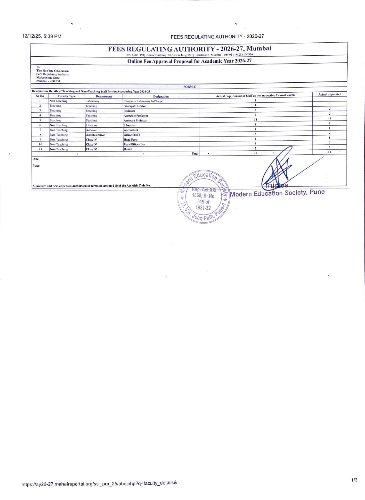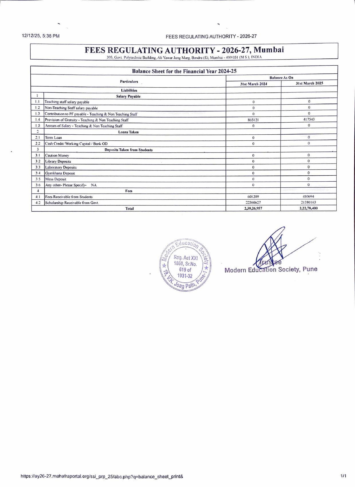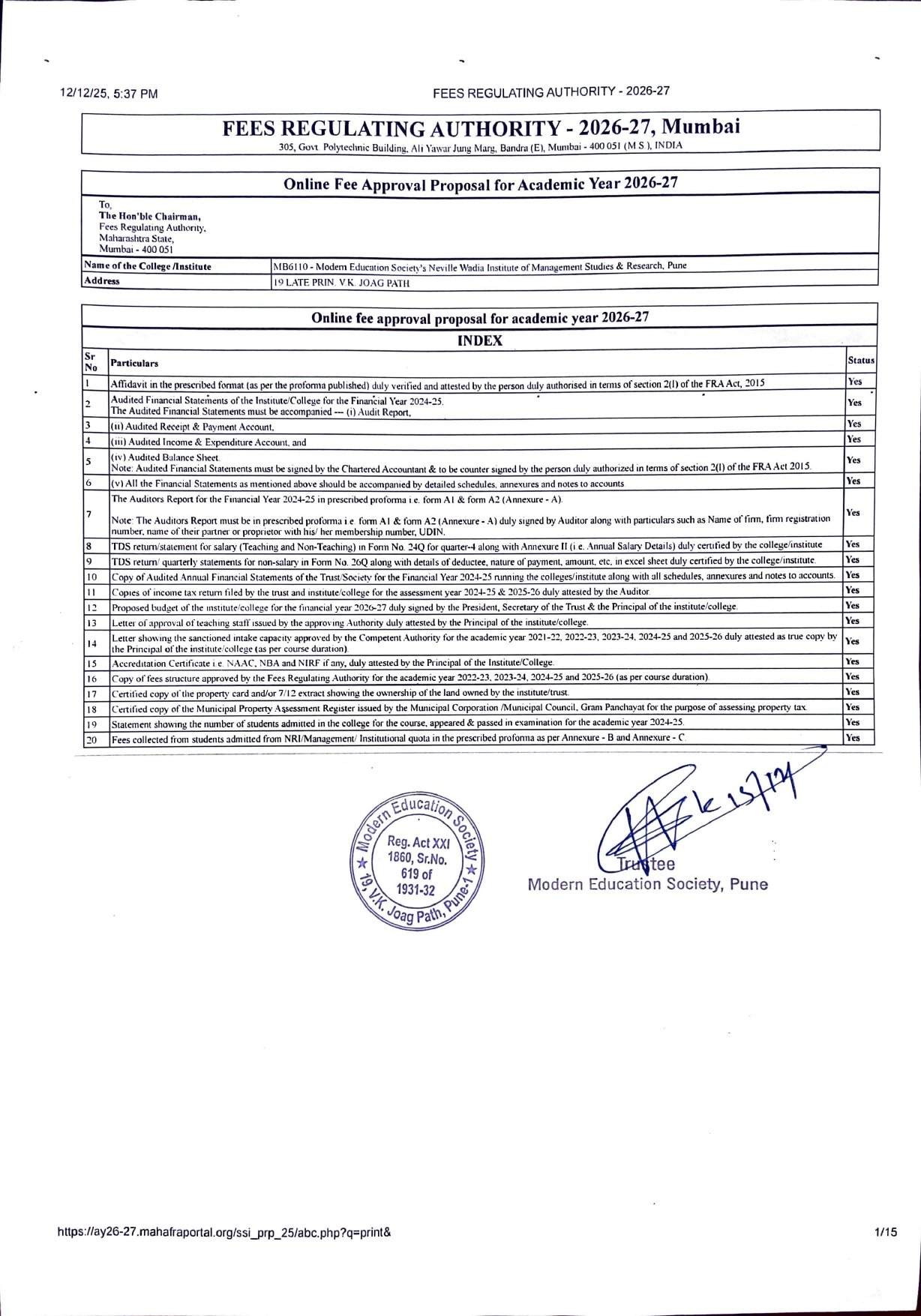 ( Note : As per the latest directives of Fee Regulating Authority (FRA), Mumbai