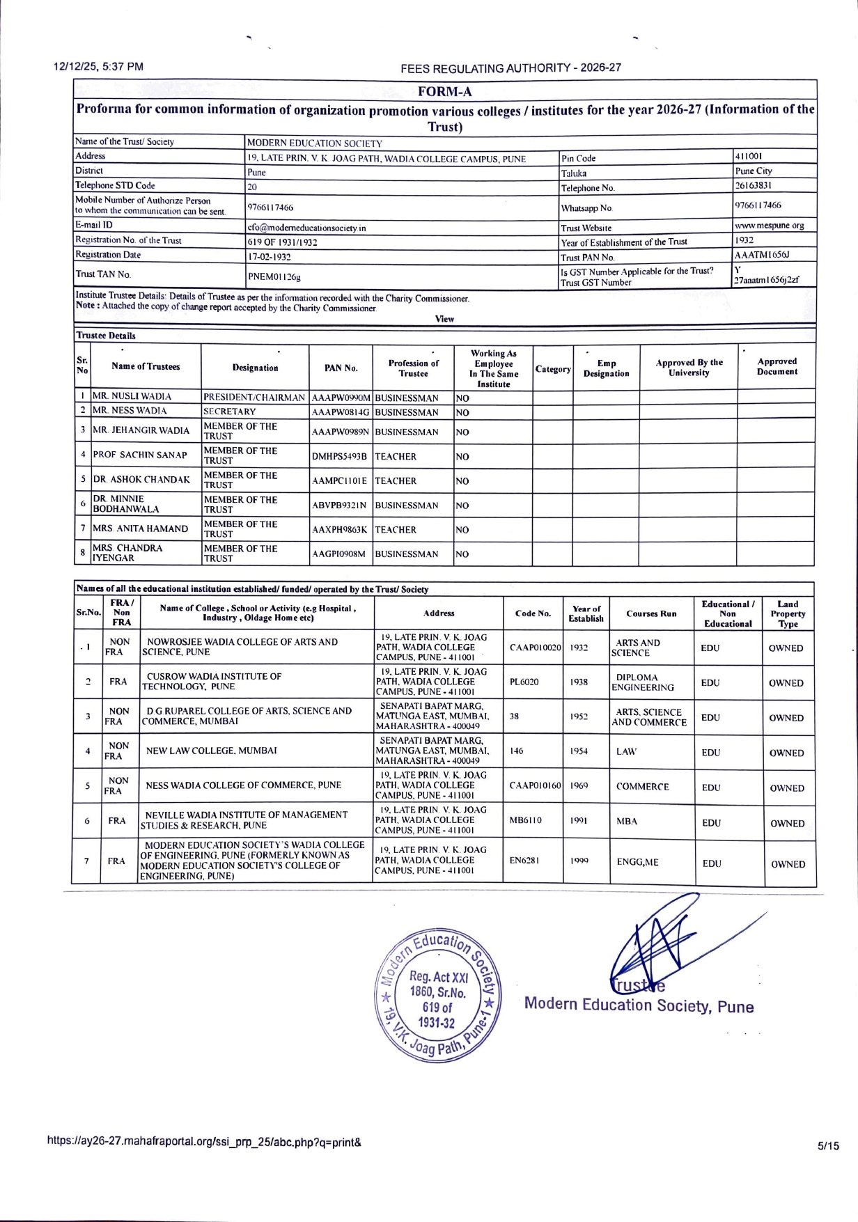 | 3 | Mr. Dattatraya Khandagale | Scholarships/ Eligibility/ Examination | Jr. Clerk | datta.khandagale@nevillewadia.com |